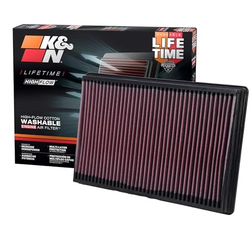 The K&N High-Flow Original Lifetime Engine Air Filter is designed to increase horsepower and acceleration. Its rugged construction ensures durability, while four layers of protection effectively trap harmful contaminants. This filter requires cleaning only every 75,000 miles, making it a long-lasting investment for your vehicle.