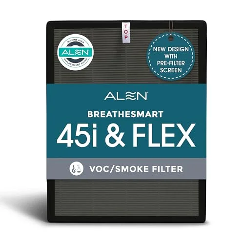 The Alen 45i & Flex Replacement Air Filter features a B4-VOC/Smoke H13 True HEPA + Carbon Filter. It captures 99.9% of airborne particles and offers a 12 to 15 months lifespan. Ideal for smoke and VOC removal, it promotes cleaner air quality efficiently.