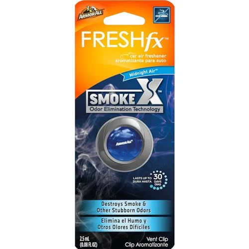 Armor All Fresh FX Smoke X Car Odor Eliminator features Odor Elimination Technology, effectively destroying smoke and other stubborn odors. Its sleek design allows for easy vent clip attachment. The Midnight Air scent lasts up to 30 days, providing long-lasting freshness for your vehicle.