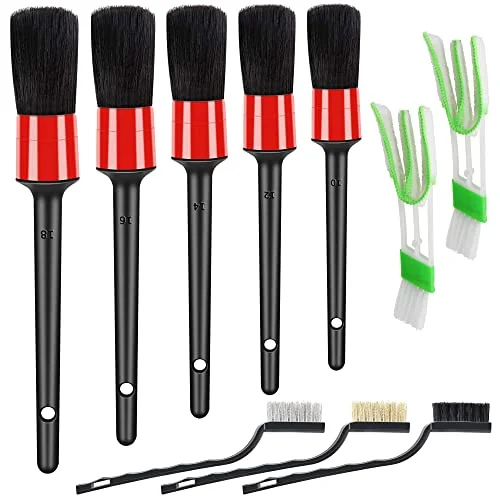 HMPLL Auto Car Detailing Brush Set includes 10 brushes, featuring 5 boar hair, 3 wire, and 2 air vent brushes. Its various sizes allow access to tight spaces and hard-to-reach areas. The bristles are solvent-resistant and durable, ensuring effective cleaning without leaving scratches.