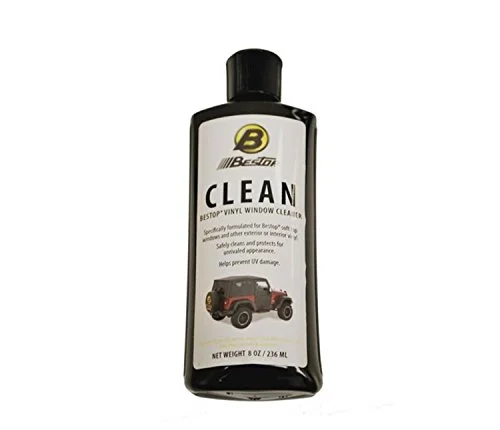 Bestop 11203-00 Vinyl Window Cleaner is specifically formulated for vinyl soft top Jeep windows. This 8 oz. bottle safely cleans and polishes dirty or lightly scratched windows. It helps prevent damage from sun exposure, making maintenance easy with a simple wipe-on and buff-dry application. It is non-irritating and biodegradable.