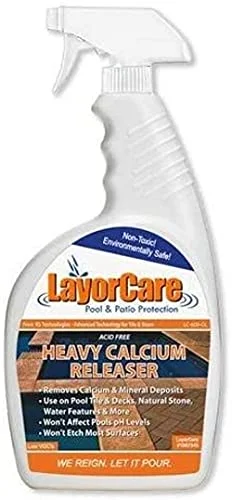 LayorCare Heavy Calcium Releaser is a powerful cleaner designed to remove calcium buildup from pool tiles and outdoor surfaces. It covers up to 75 sq ft with its full-strength formula, ensuring maximum effectiveness without dilution. This non-toxic cleaner is safe for most surfaces and provides quick results.