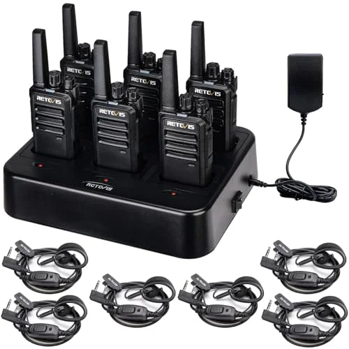 Retevis RT68 Walkie Talkies are portable FRS two-way radios with a six-way multi-unit charger. They feature efficient and rapid charging, safe charging protections, and a rugged design for durability. With long-range capabilities and clear sound, these radios stand out for their reliability in demanding environments.