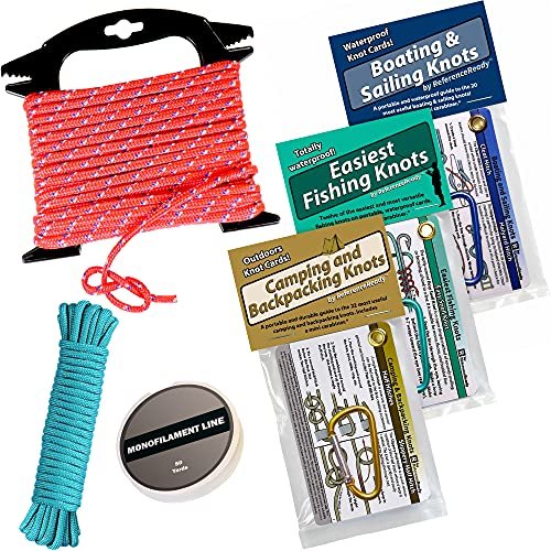 The ‘Deluxe Knot Tying Kit with Rope, Cord, Fishing Line, and 3 Knot Tying Guides’ by ReferenceReady, priced at $34.99, is a comprehensive solution for novice and experienced outdoor enthusiasts alike. This kit includes three sets of waterproof knot cards and an impressive variety of ropes, cords, and fishing lines. Covering 42 essential knots for boating, camping, and fishing, it equips users with all necessary tools to master knot tying effectively.