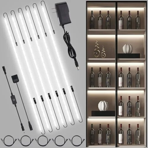 JUSJUBR LED Lights for Shelves come with six 20-inch dimmable COB LED strip lights. The cold white 6000K lights ensure even light distribution, eliminating dark areas. With a touch dimmer switch, users can easily adjust brightness. The ultra-thin design allows for discreet installation.