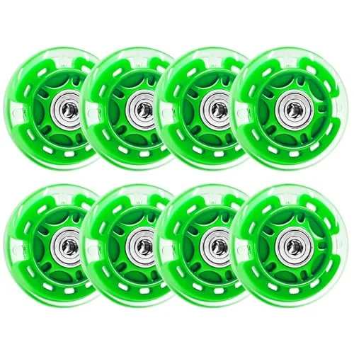 Nezylaf 4 Pack Light Up Roller Skate Wheels feature a unique design that adds fun and safety during nighttime skating. Measuring 32 x 58 mm with a hardness of 78A, these wheels come with 608 bearings pre-installed, providing a smooth ride. Their silicone material ensures durability and consistent performance on multiple surfaces.